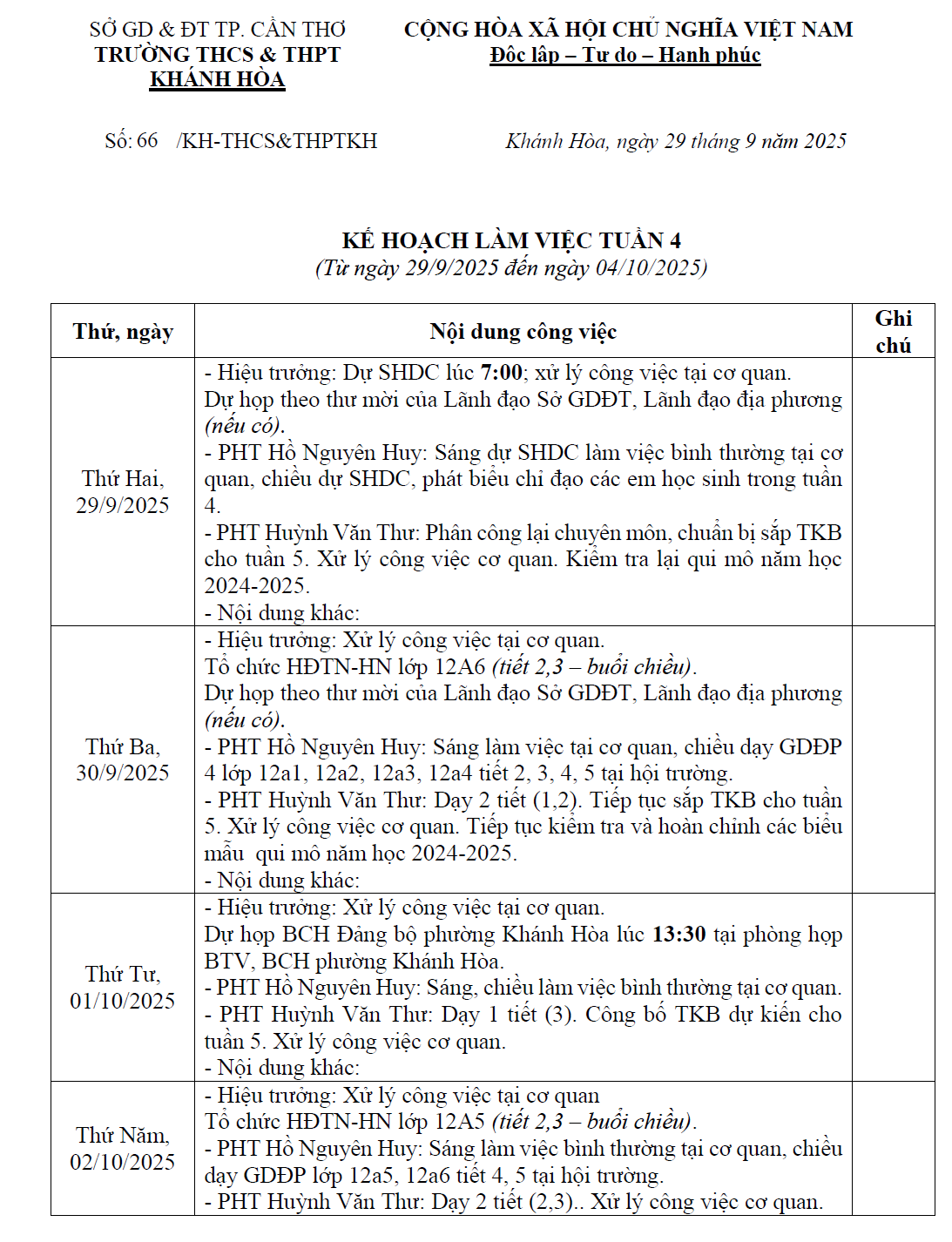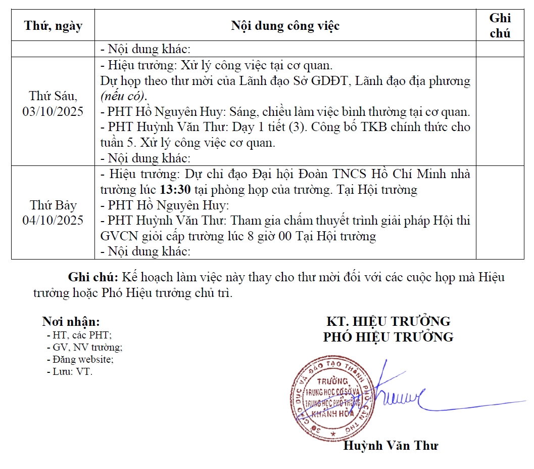 KẾ HOẠCH LÀM VIỆC TUẦN 4 (29/9/2025 - 04/10/2025)