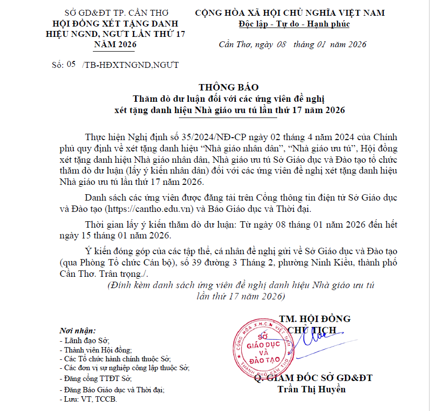THÔNG BÁO - Thăm dò dư luận đối với các ứng viên đề nghị xét tặng danh hiệu Nhà giáo ưu tú lần thứ 17 năm 2026